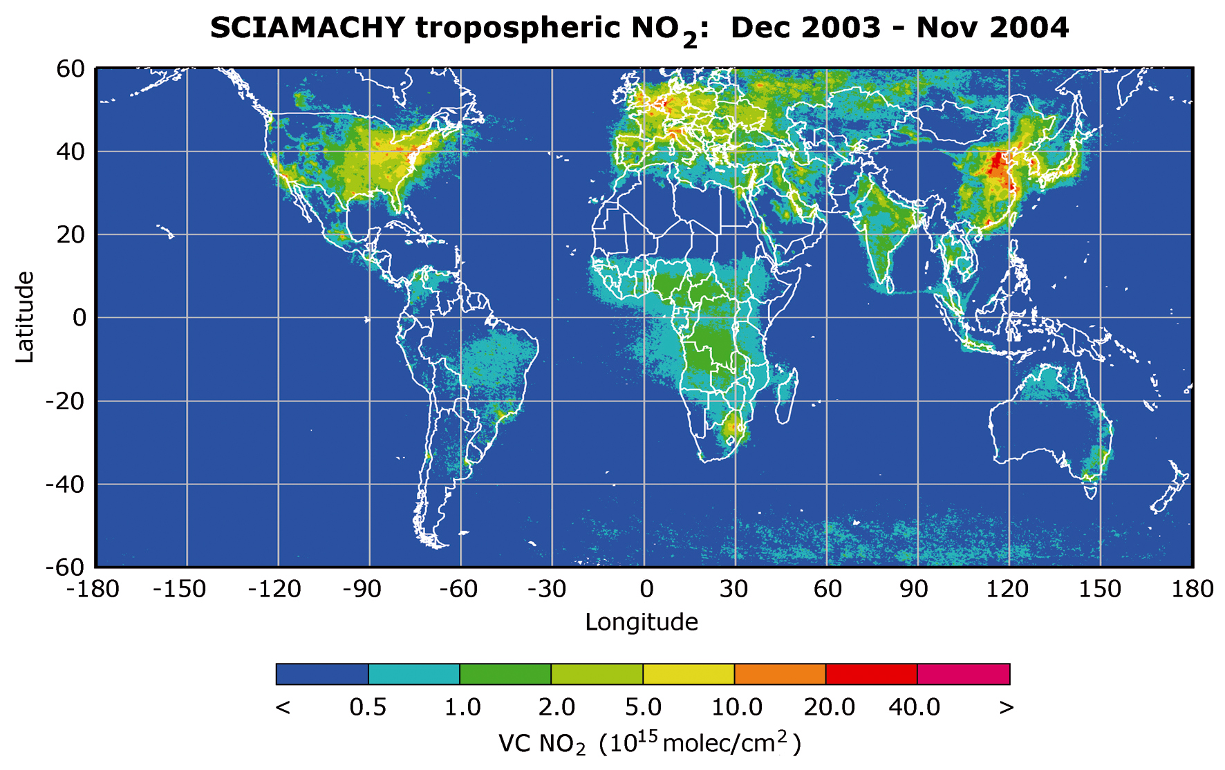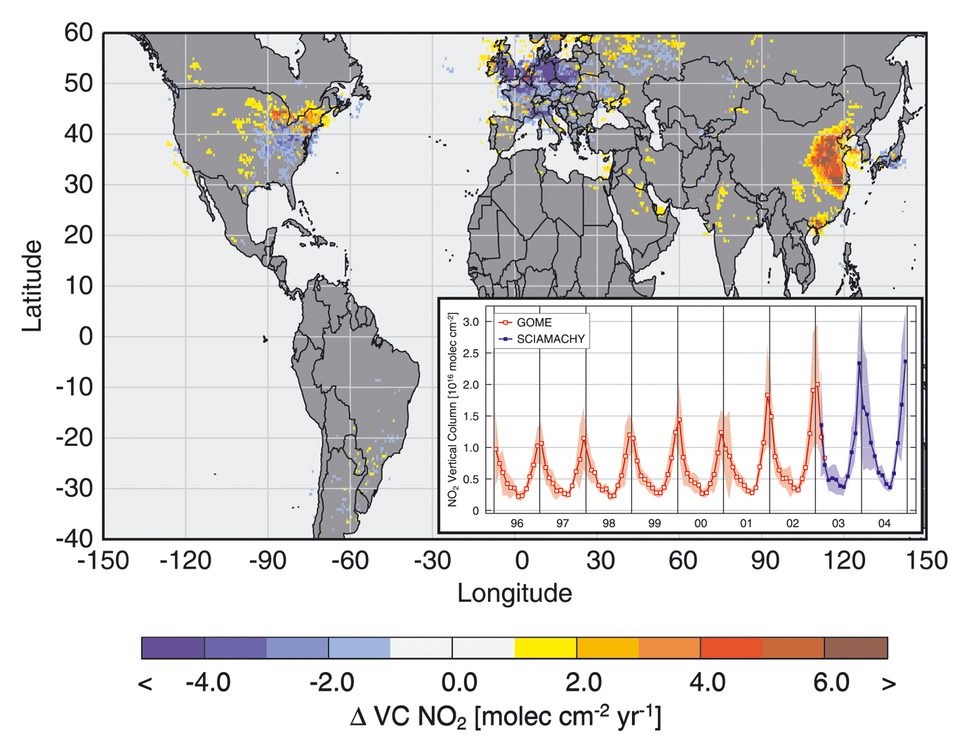 in global tropospheric NO2 concentrations from 1996-2002. The inset illustrates