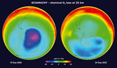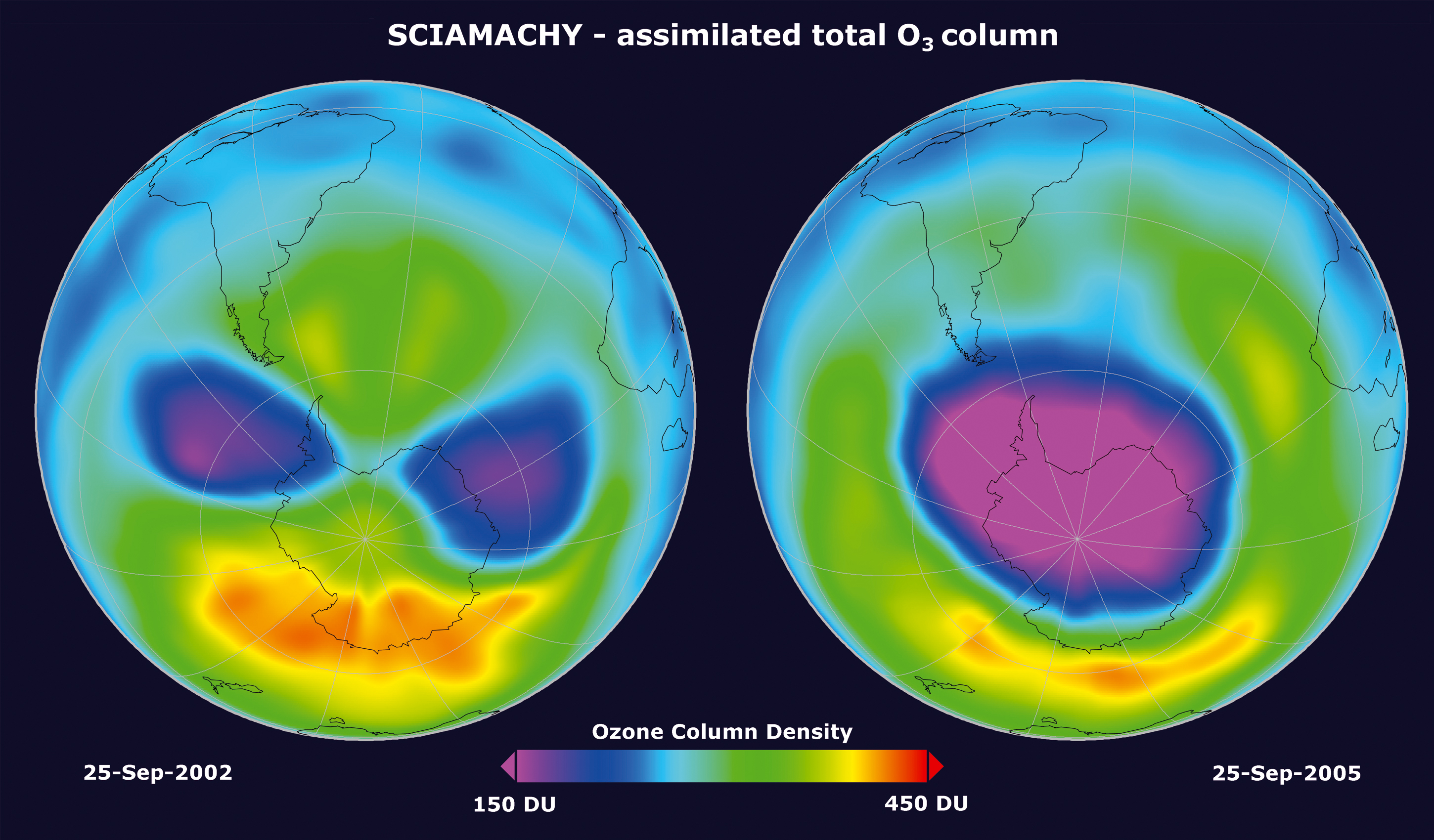 Antarctic ozone hole in 2002 (left) and 2005 (right). SCIAMACHY total