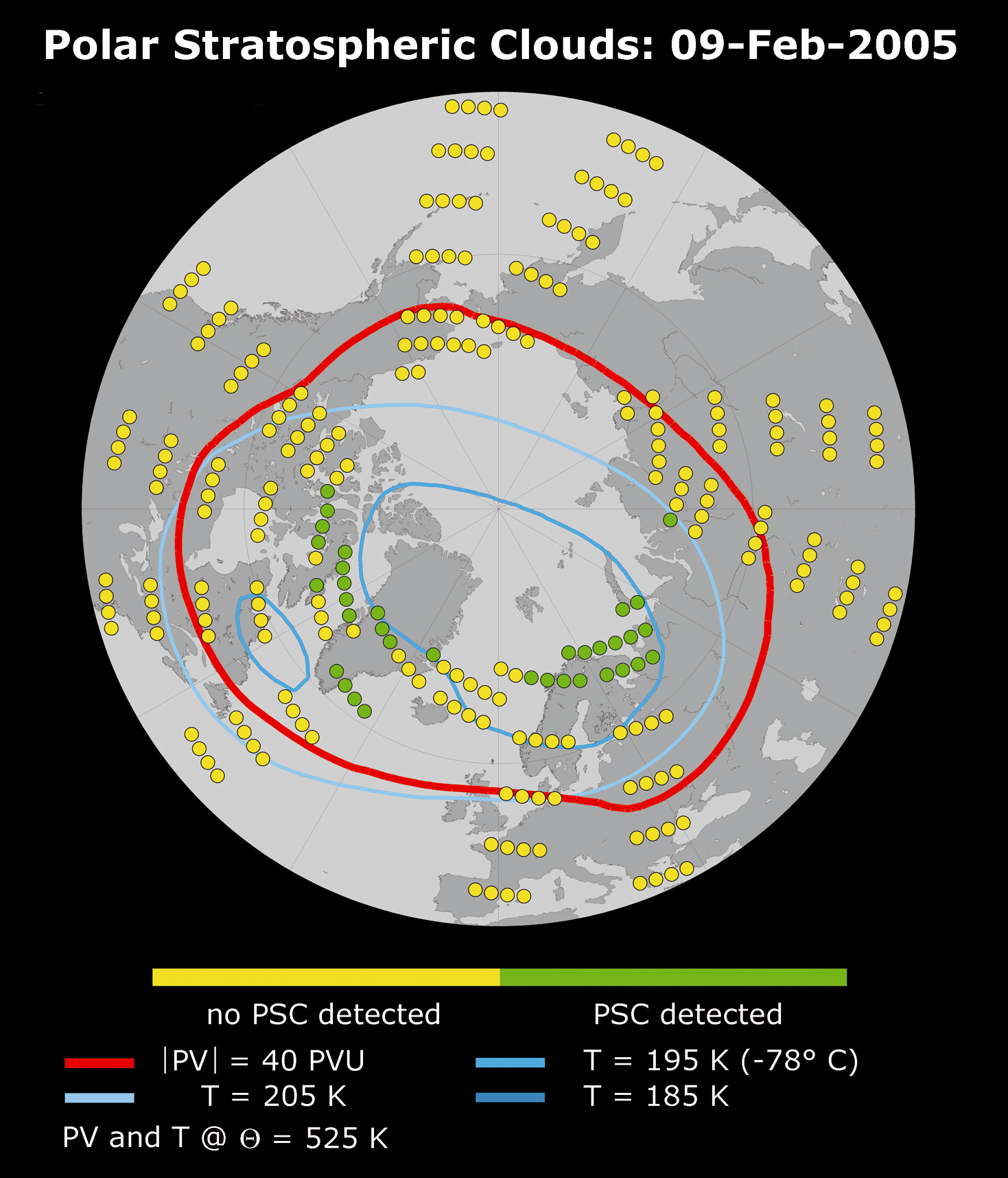 hemisphere map of PSCs for February 9th, 2005. The circles indicate the locations of