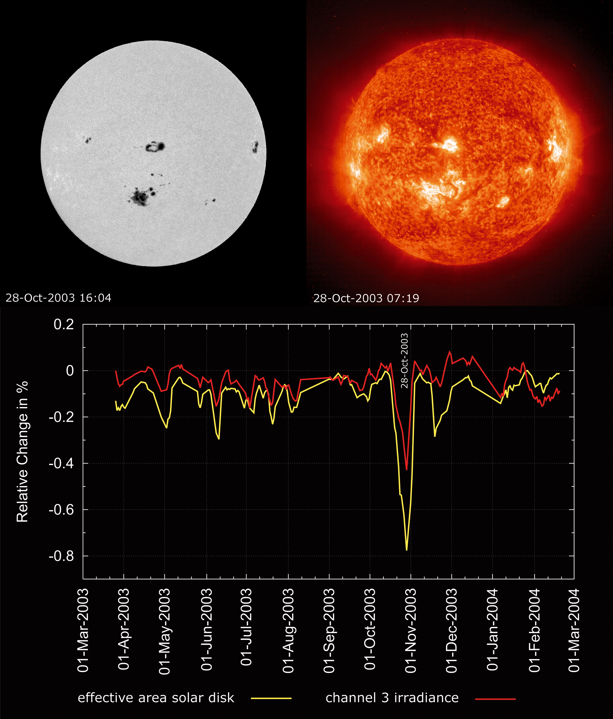 active sun on October 28th, 2003, in white light (top left), EUV at 304 Å (top right) and the signal in