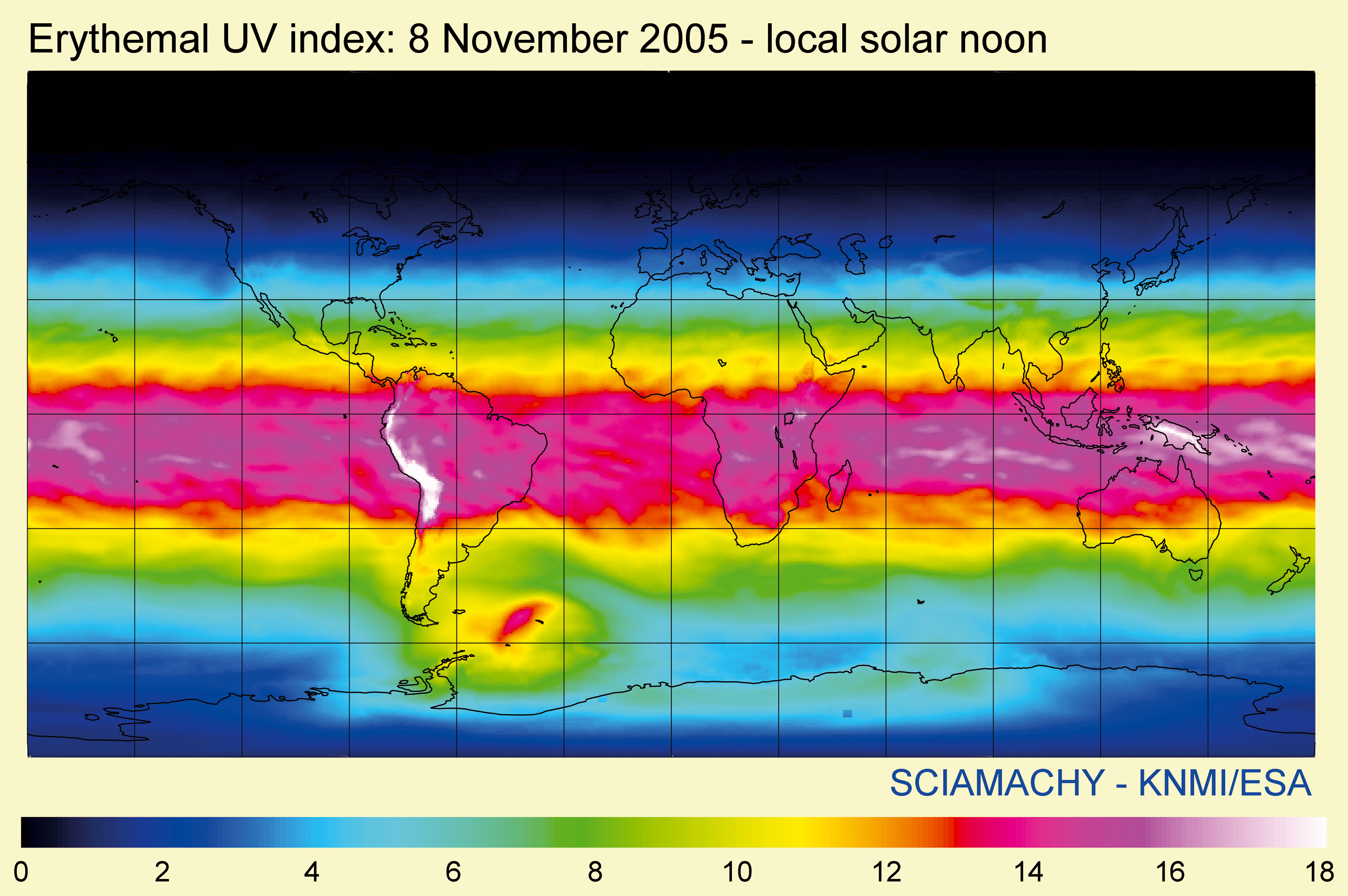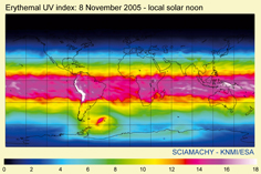 global UV index on November 8th, 2005. Red denotes high, blue low UV irradiance. (image: KNMI/ESA) |