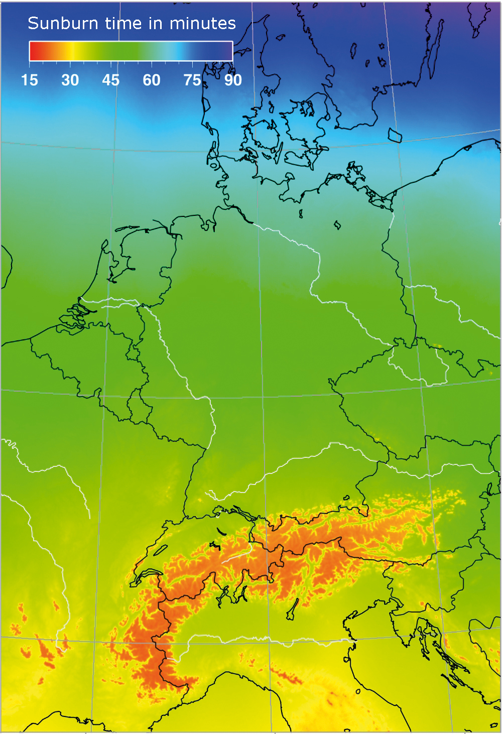 sunburn time in central Europe in winter. In the Alps at high elevation UV radiation begins to redden