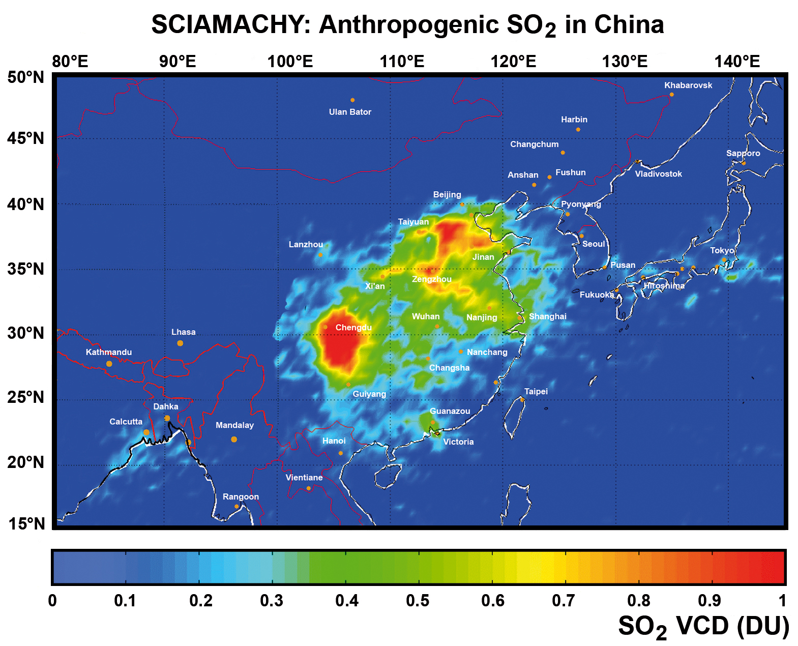 SO2 column densities over eastern China during the year 2003. SCIAMACHY's