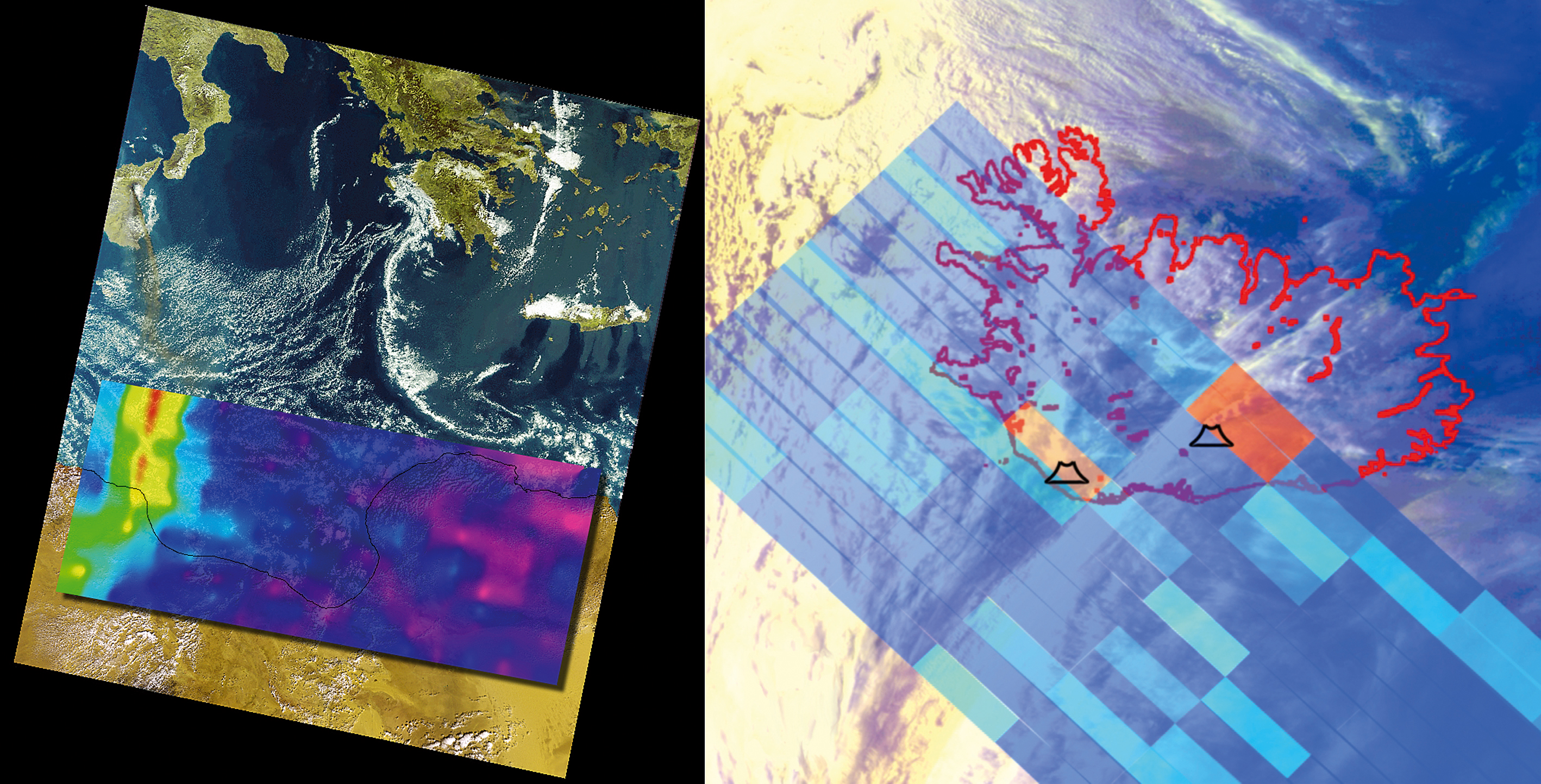 that the plumes of SO2 and visible ash match well. In the Iceland image (right) detected SO2 emission at Grimsvötn