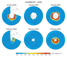 of chlorine as depicted by the red areas in the 2005 OCIO maps. (images: A. Richter, IUP-IFE, University of Bremen) |
