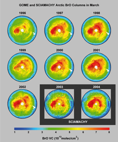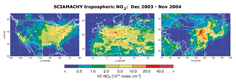 from 1996-2004 using data from GOME and SCIAMACHY. (images: M. Van Roozendael, BIRA) |