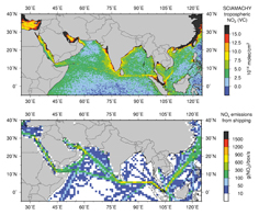 areas. In the lower panel the NOx emissions associated with shipping based on emission inventories is depicted. (image: A.