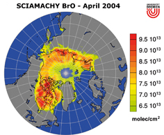 concentrations over the arctic sea ice in April 2004. (image: DLR-DFD and IUP-IFE, University of Bremen) |