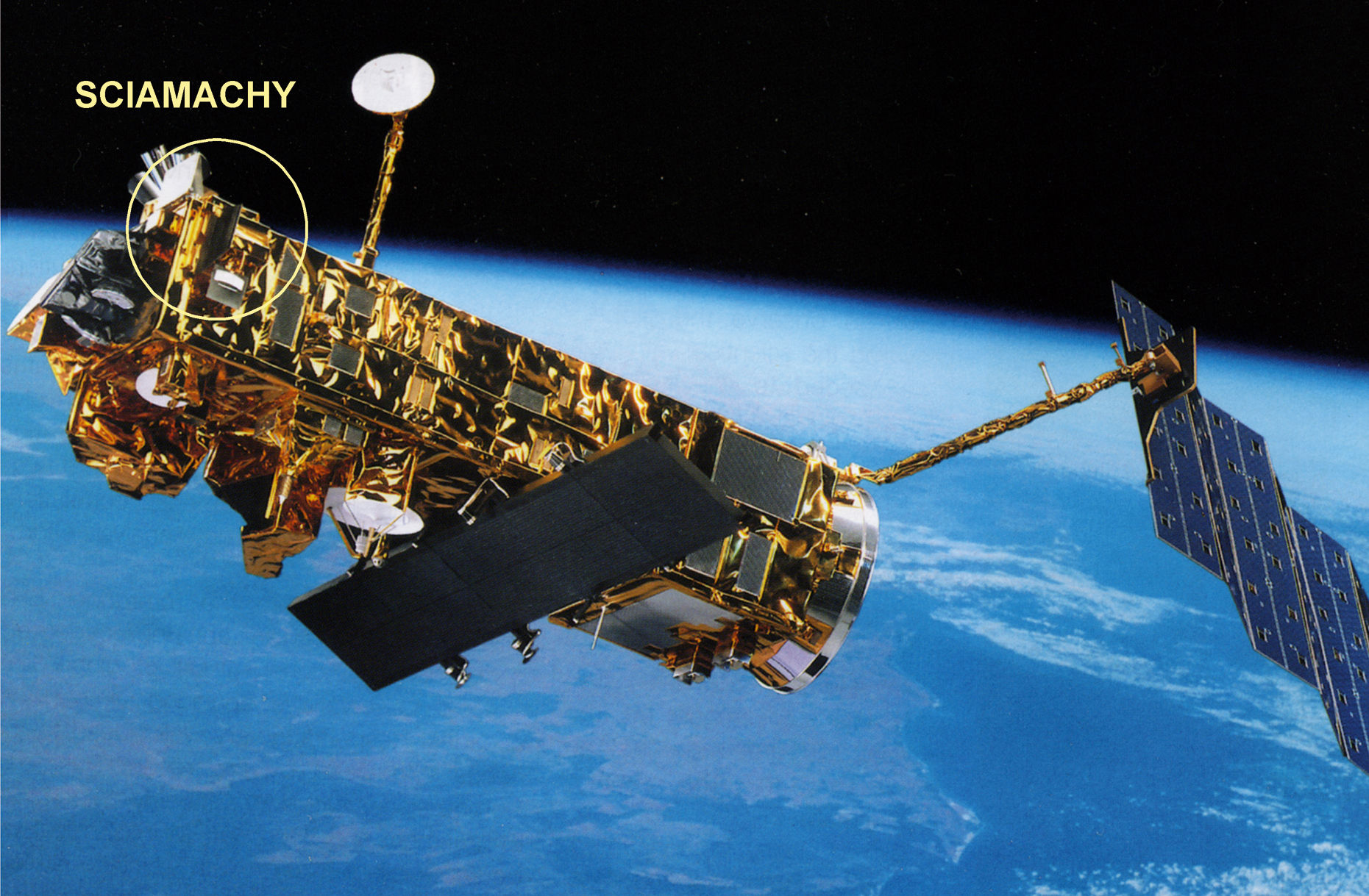 The total field of views of the atmospheric mission instruments. SCIAMACHY accesses nadir (1) and limb in flight direction (2). MIPAS
