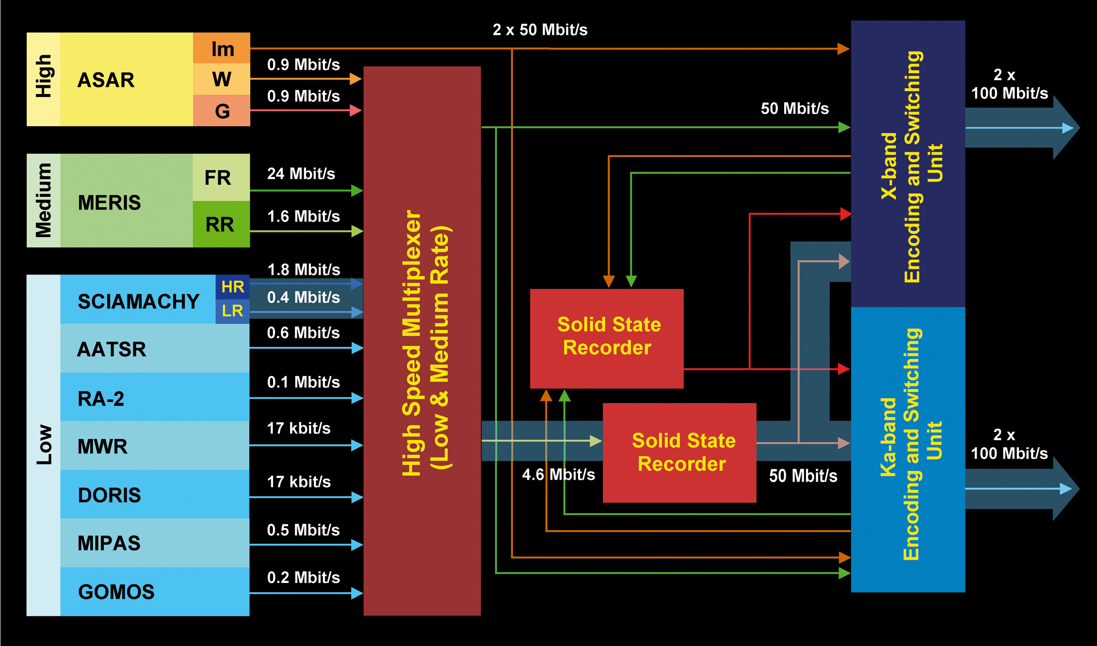 Schematic view of the ENVISAT on-board data handling. SCIAMACHY shares HSM resources with the other instruments generating low rate
