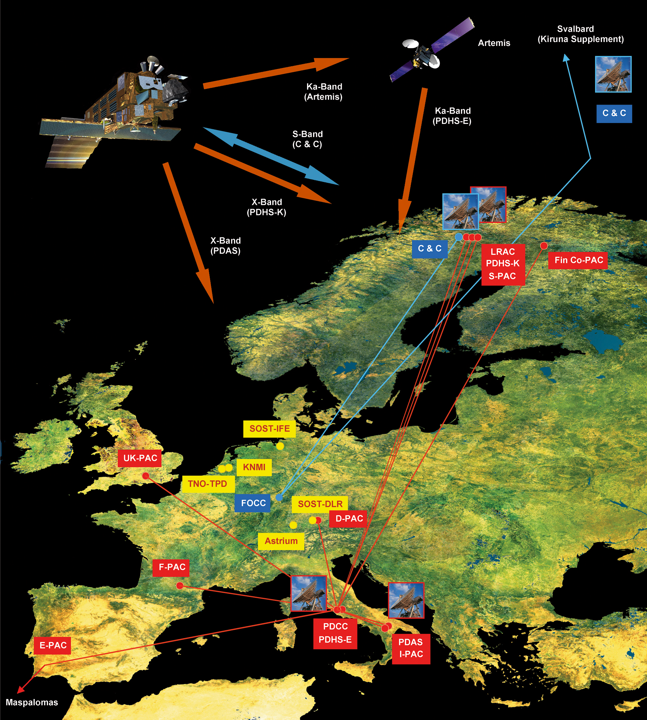 The European wide distributed ENVISAT ground segment (FOS: blue, PDS: red, SCIAMACHY specific DDS stations in the Commissioning Phase: