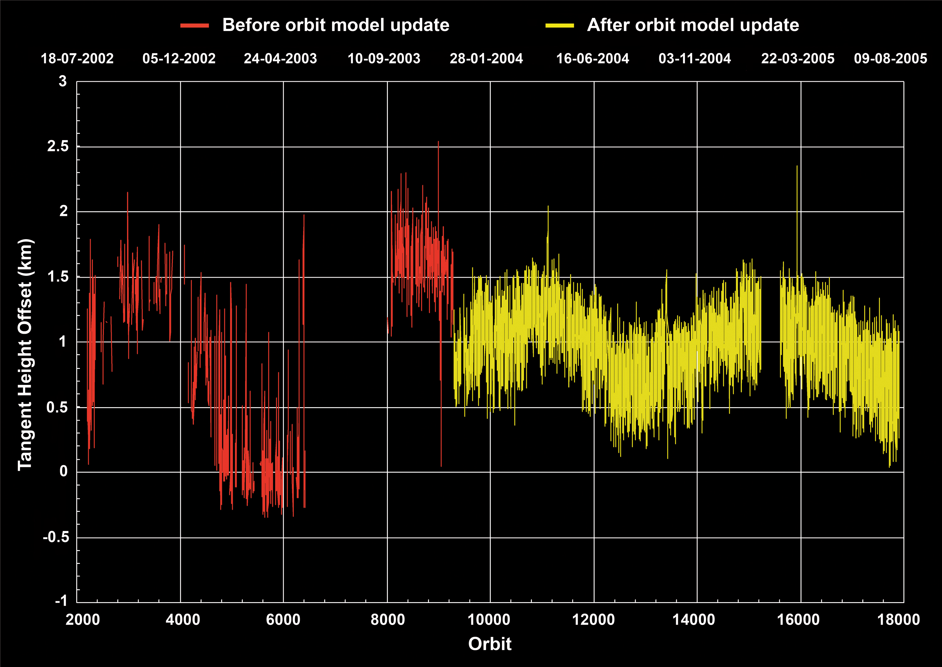 After the update of the on-board propagator model this variation is reduced but a constant offset