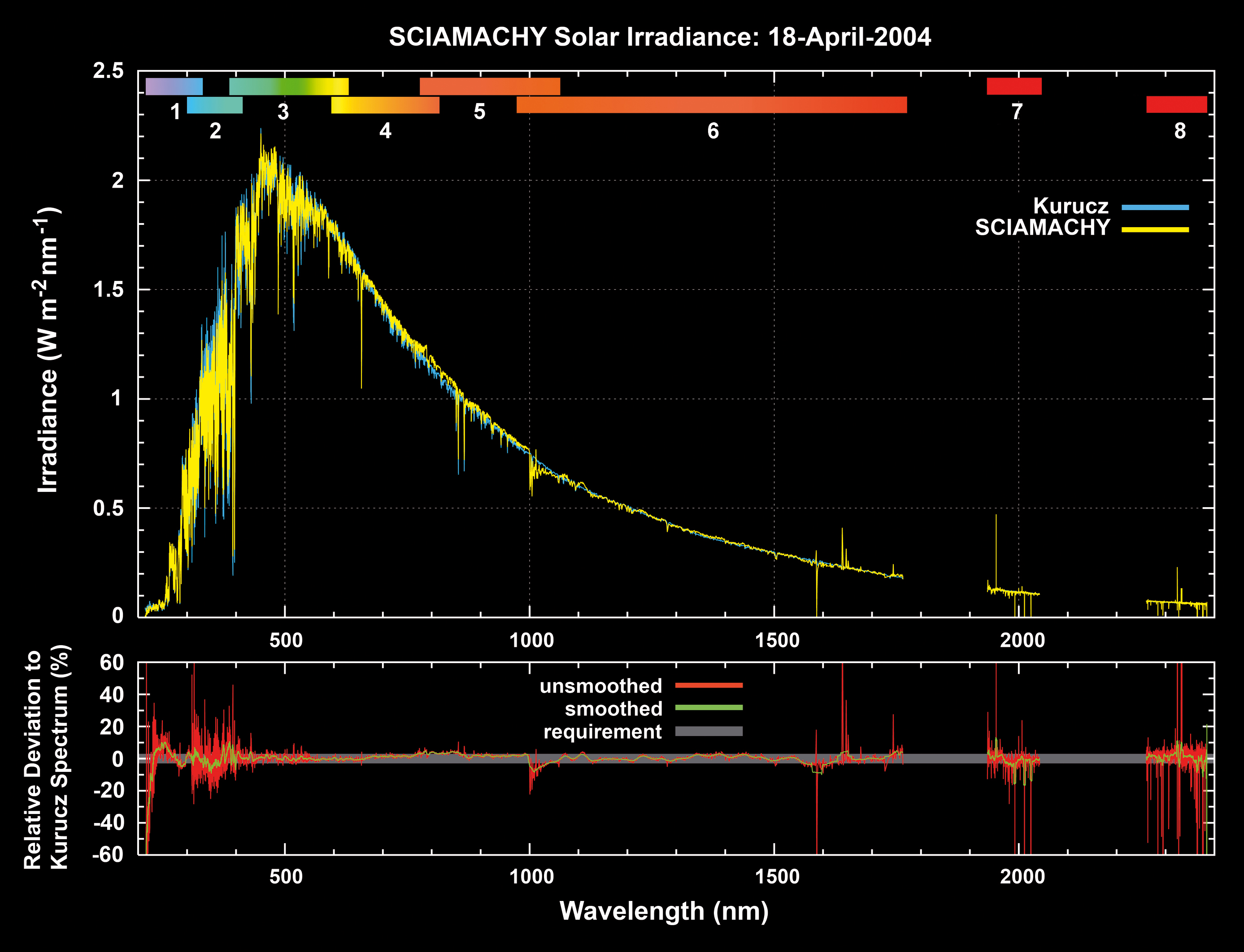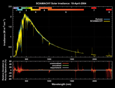 SCIAMACHY solar irradiance spectrum measured April 18th, 2004, in comparison to the Kurucz solar reference spectrum. SCIAMACHY data