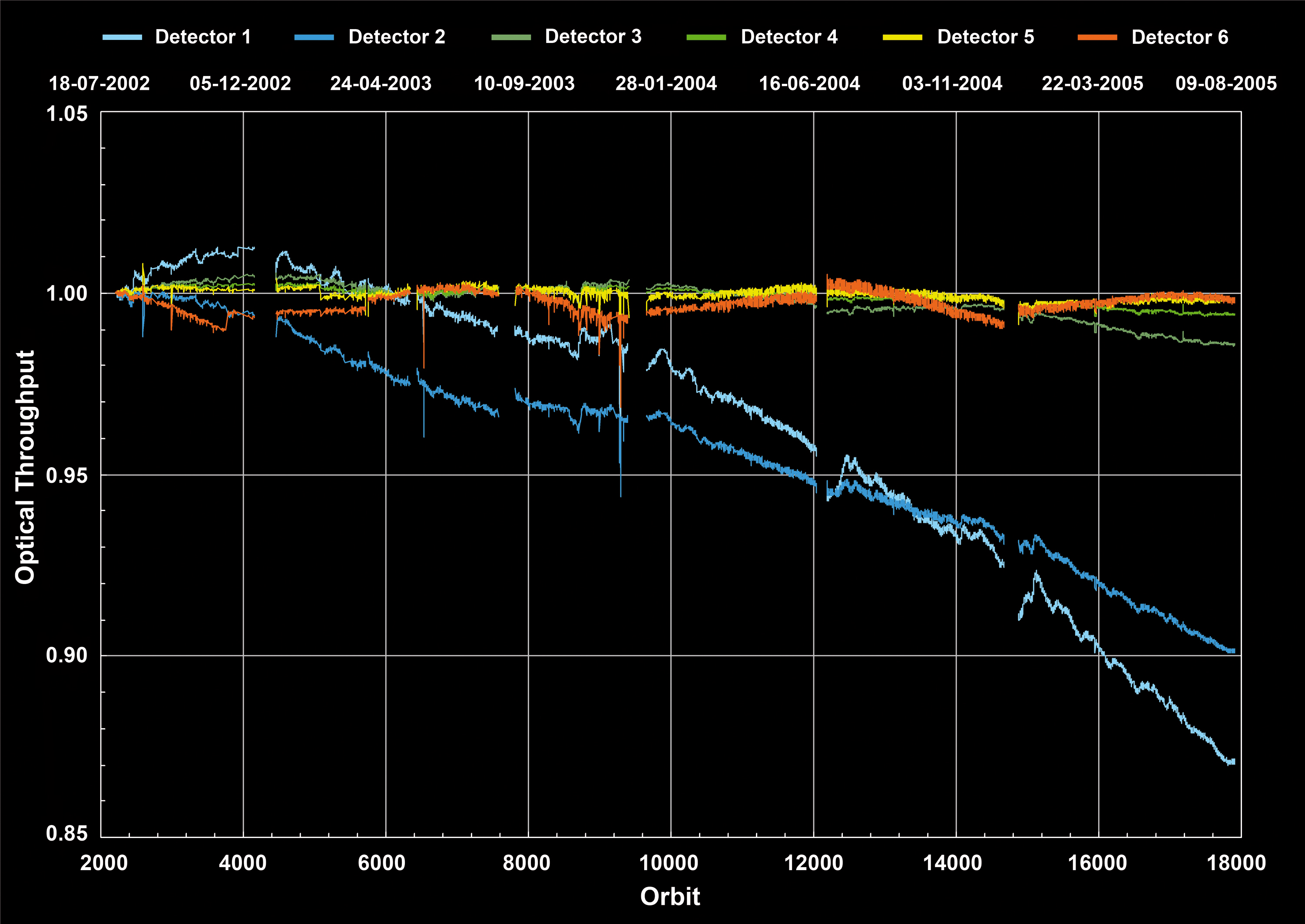 mainly affecting channels 4 & 5. The increase around orbit 5000 corresponds to an