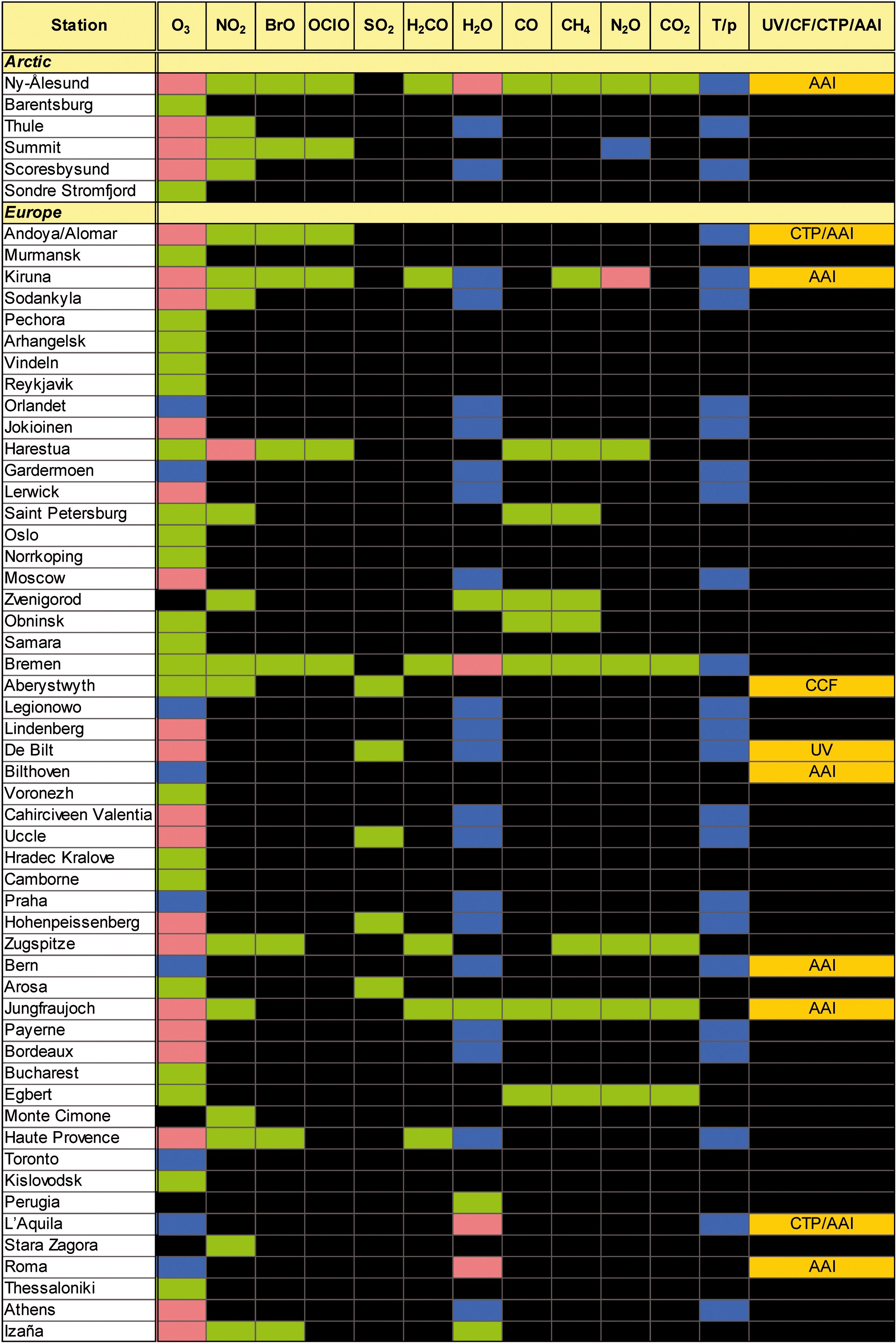stations contributing to SCIAMACHY validation and associated SCIAMACHY data products. The last column includes UV, CF (cloud fraction),