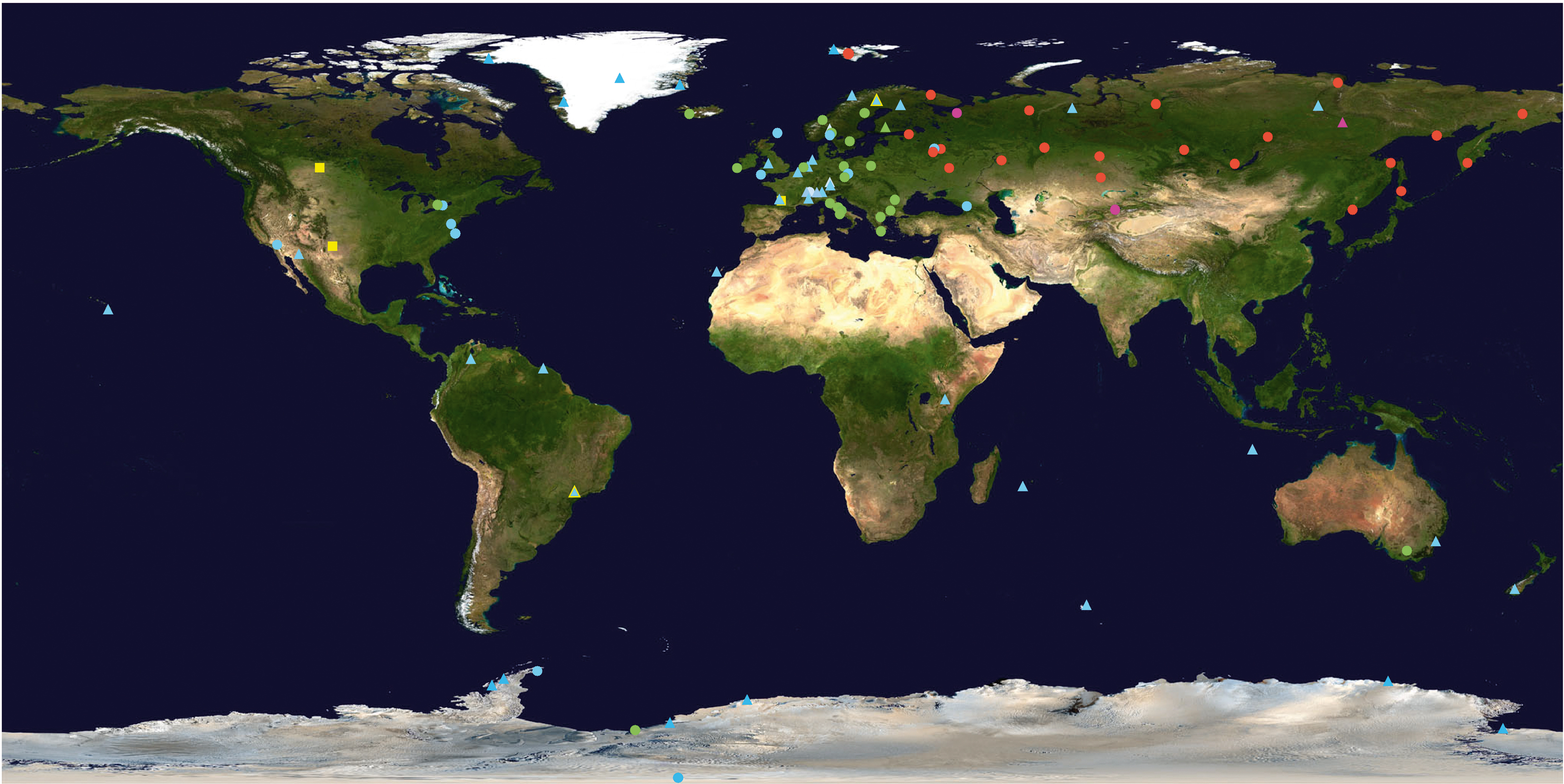 triangles = core validation station, blue = NDSC network, red = Russian/NIS M-124 network, purple = NDSC