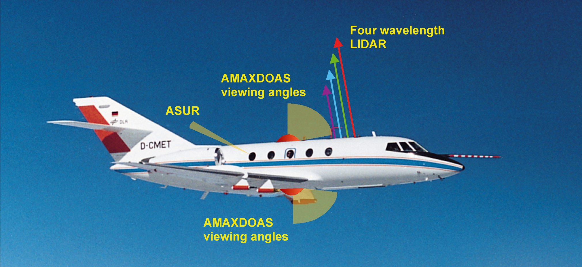 Falcon aircraft with the viewing directions of the validation instruments. (image: Fix et al. 2005) |