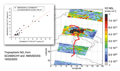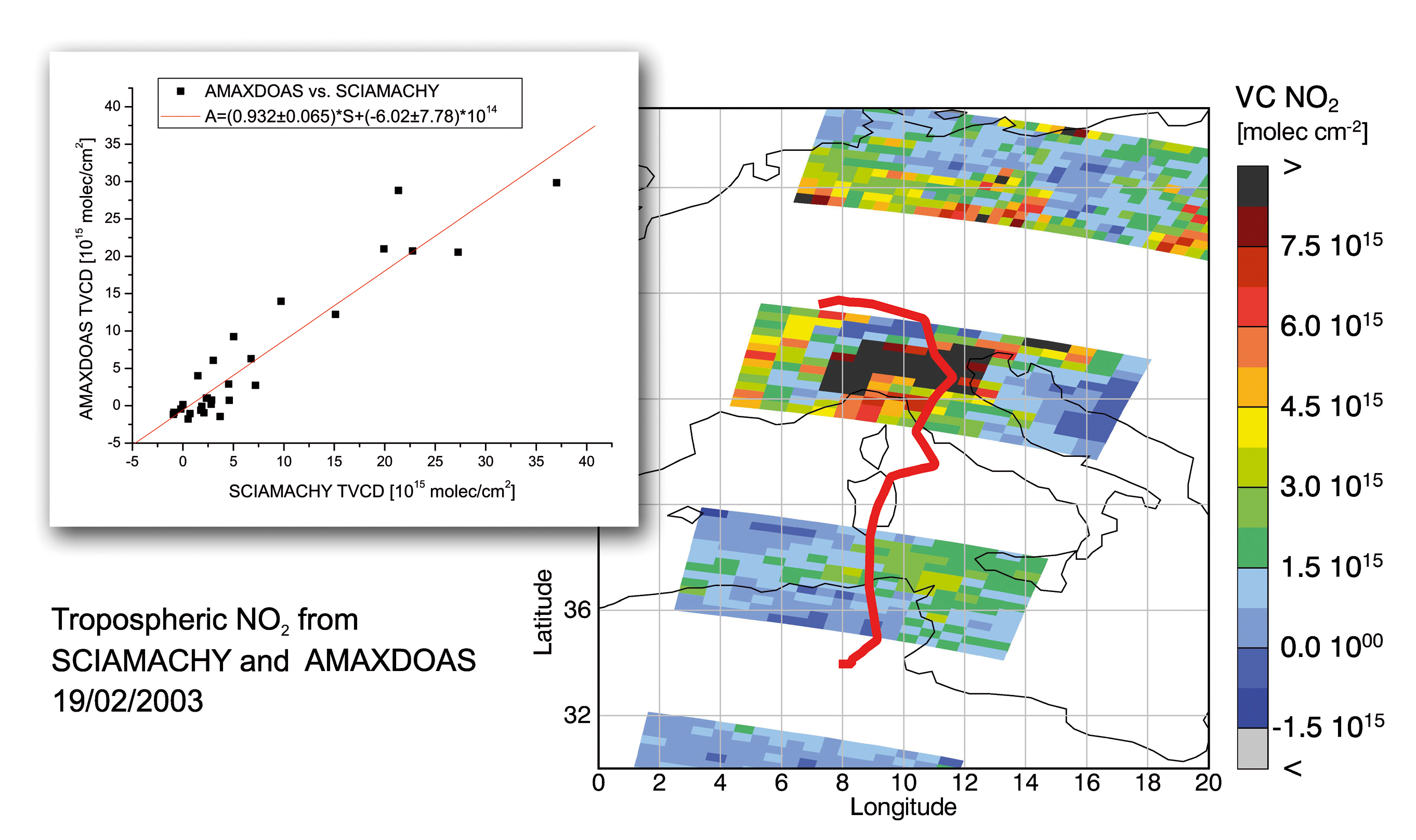 NO2 columns from AMAX-DOAS are plotted versus those from SCIAMACHY. The SCIAMACHY tropospheric NO2 columns are retrieved