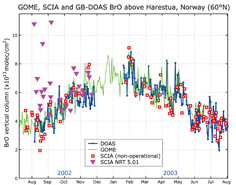 of BrO vertical columns retrieved from GOME, SCIAMACHY and ground-based DOAS measurements at Harestua, Norway, 60°N, 10°E.