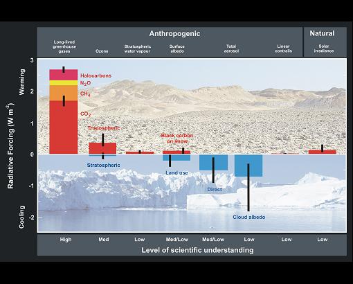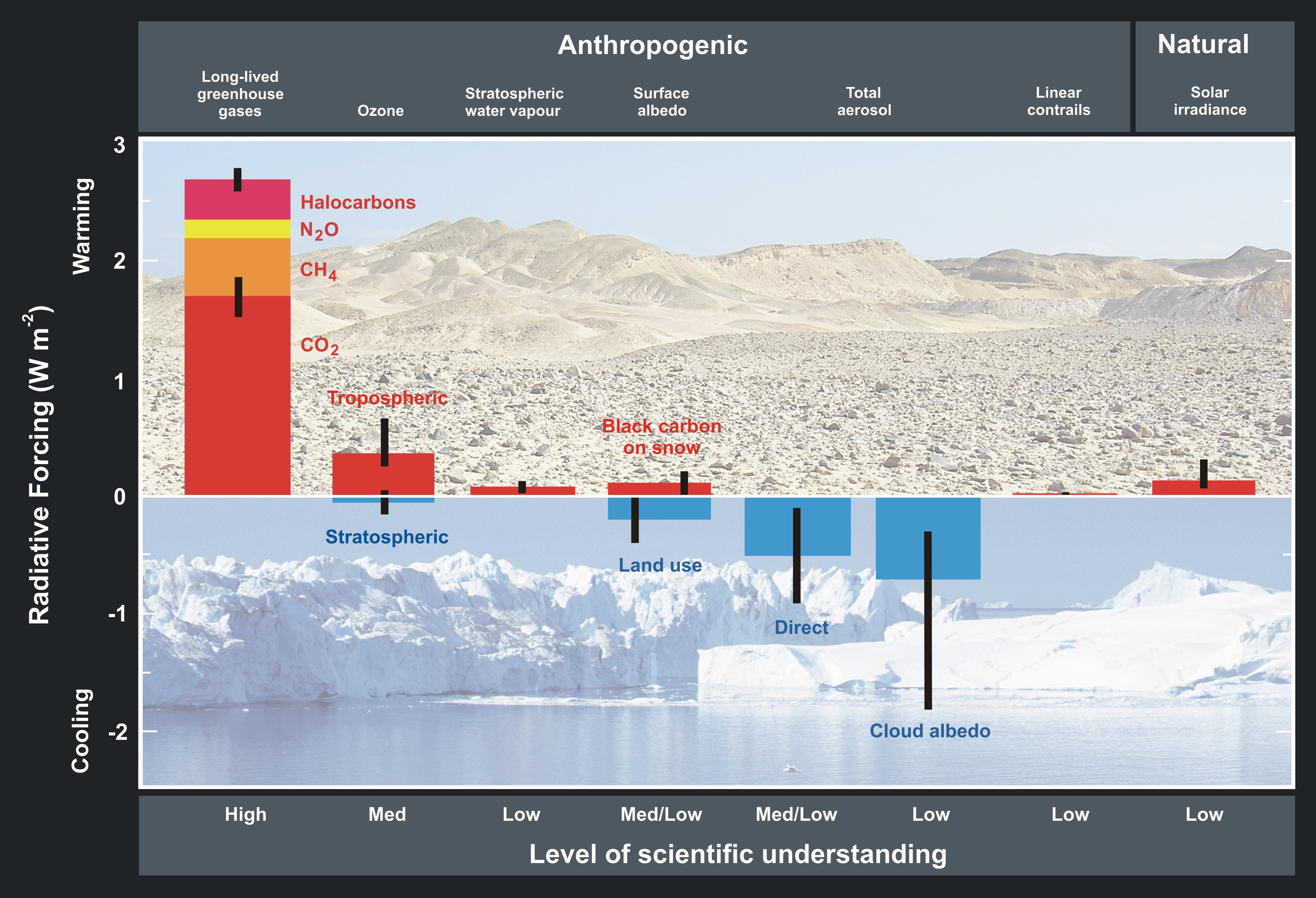 associated to each forcing, with high, medium and low levels, respectively. (Courtesy: adapted from IPCC 2007) |