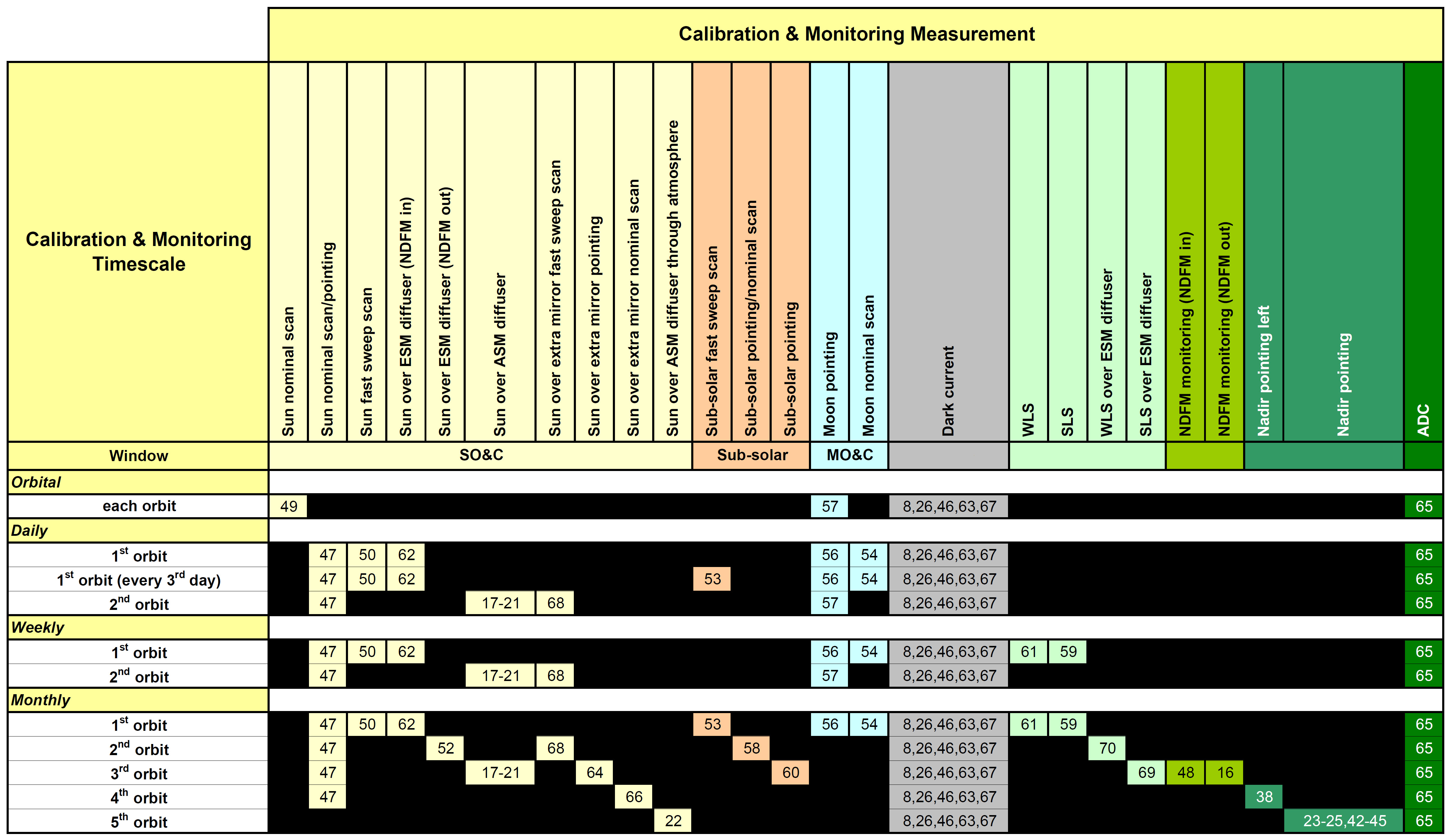 Calibration and monitoring scenarios from orbital to monthly timescales. In the top row the