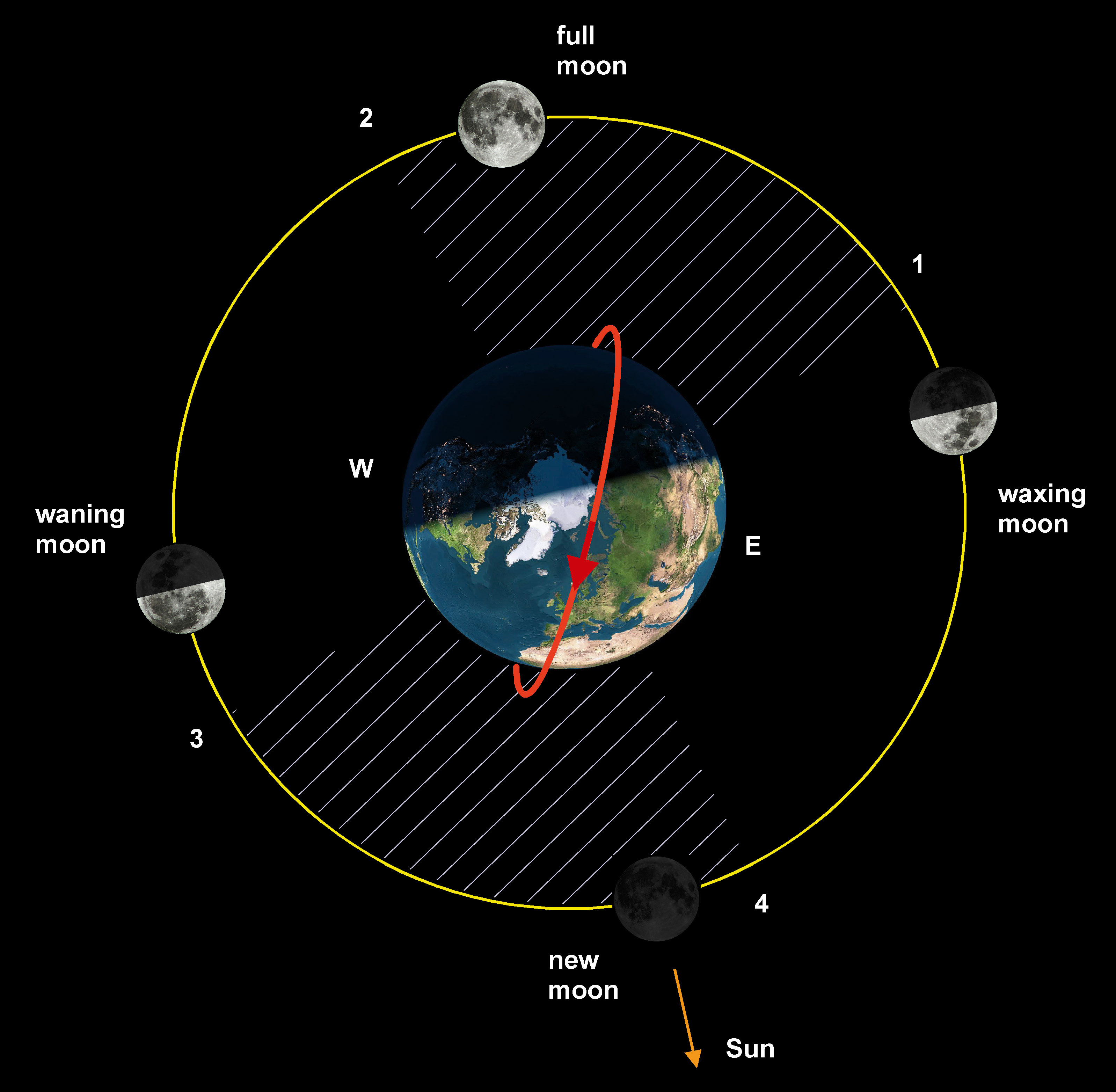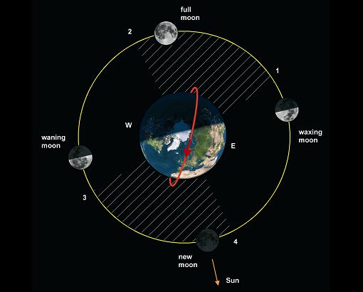 variation (red curves). The blue segments indicate lunar visibility phases where moonrise occurs on the nightside,