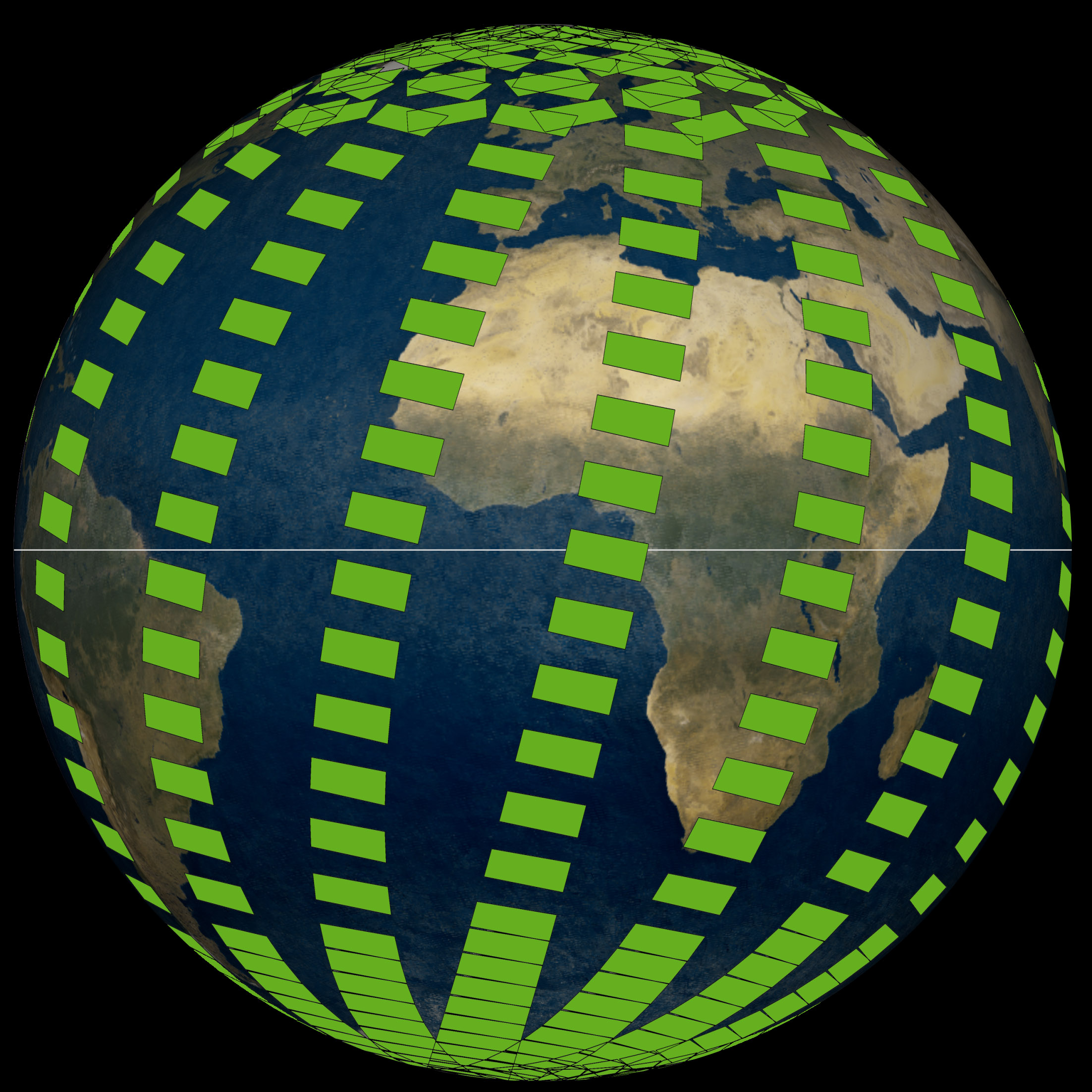 Nadir coverage after 1 day of routine measurements. At the equator consecutive nadir ground pixels are separated by about 1600 km.