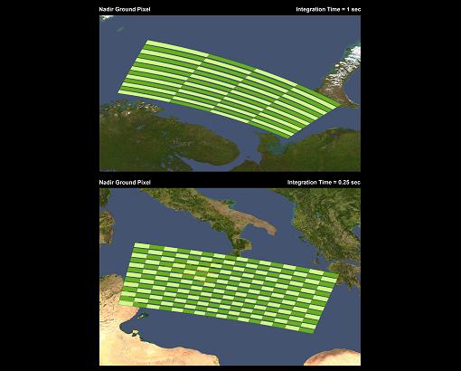 The pattern of ground pixels in a nadir measurement for an integration time of 1 sec (top) and 250 msec (bottom). Only the forward scans are shown.